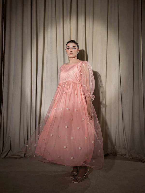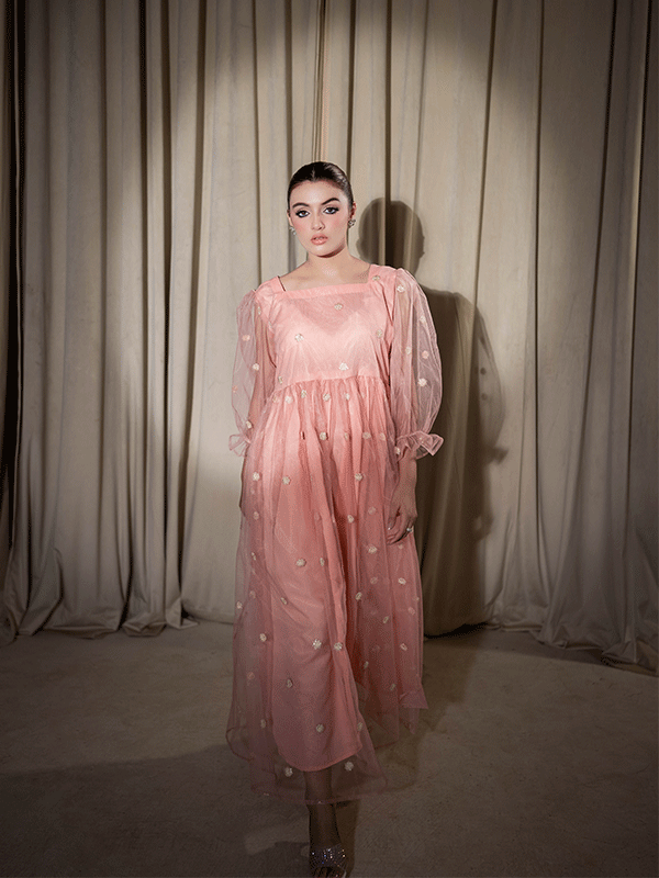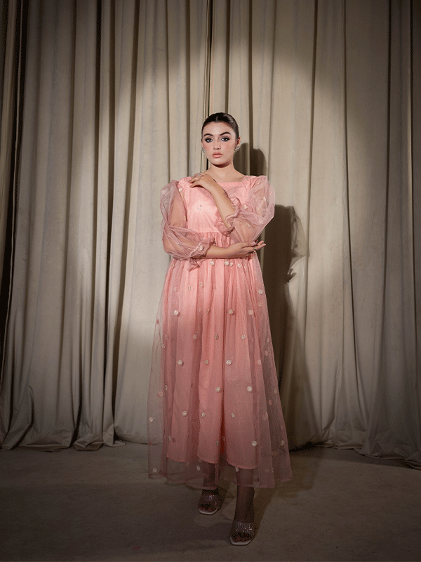 Introducing the "Peachy Glamour" Fusion Frock Dress, Adele a contemporary masterpiece in a lovely peach hue. This fusion dress elegantly combines traditional and modern elements with intricate embroidery and sequins on the delicate net fabric. Step into the spotlight and make a stylish statement with this unique frock-style dress.
