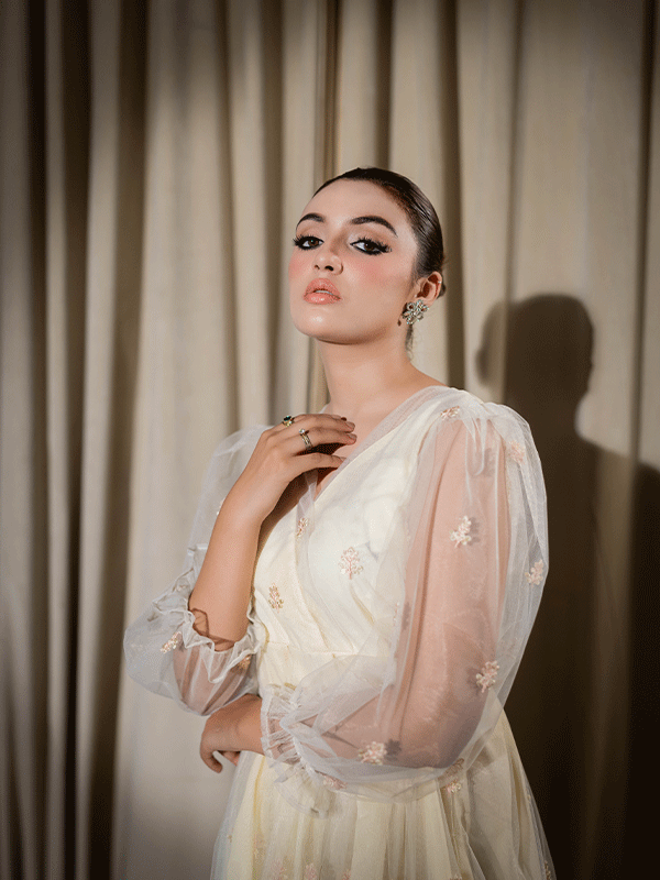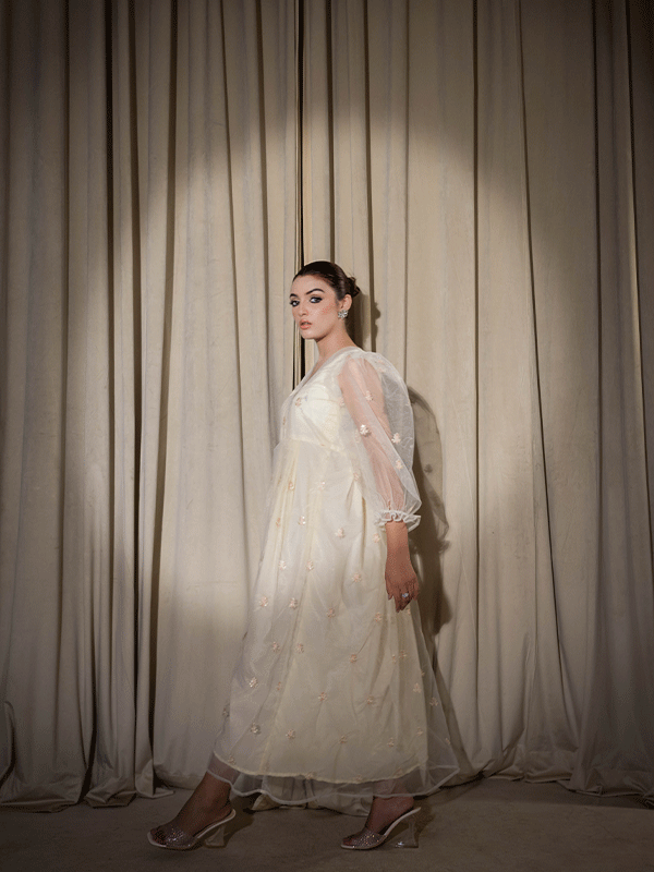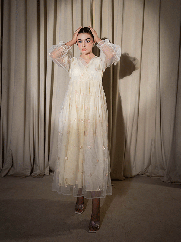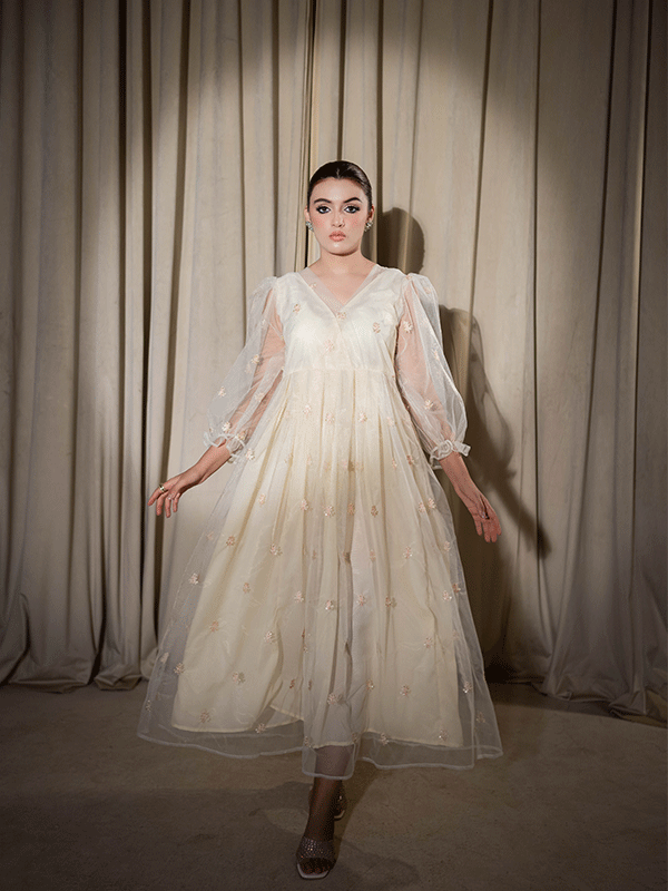 Introducing the "Chic Elegance" Fusion Frock Dress, ANNA a contemporary delight in a graceful beige. This unique ensemble seamlessly blends the traditional and modern, with intricate embroidery and sequins adorning the delicate net fabric. Step into the limelight and make a fashionable statement with this fusion frock-style dress.