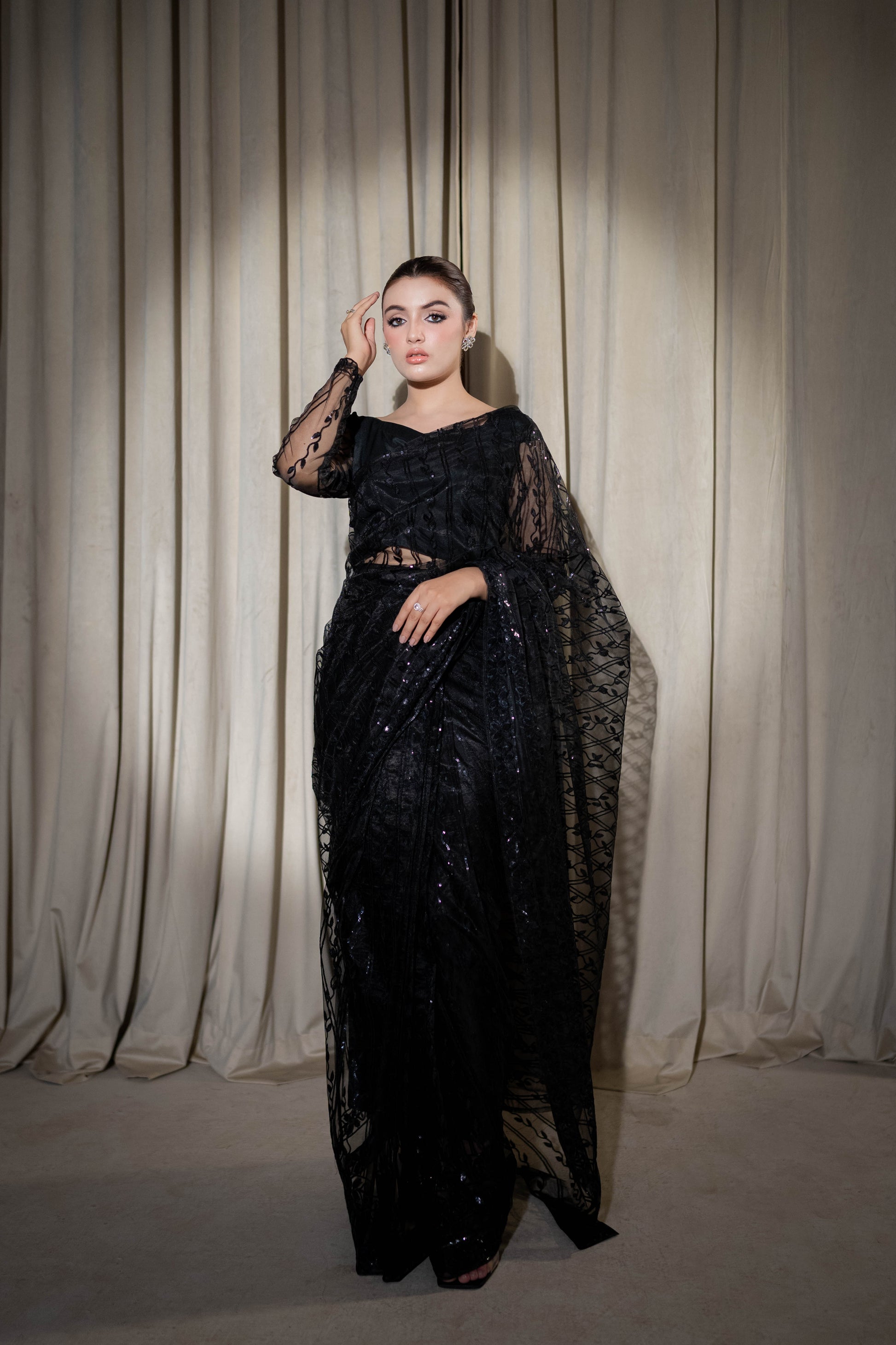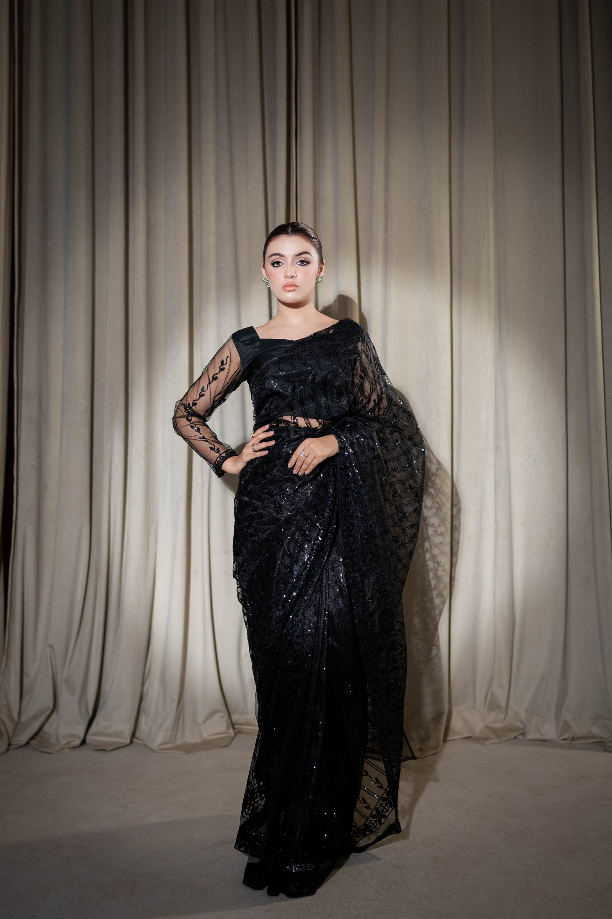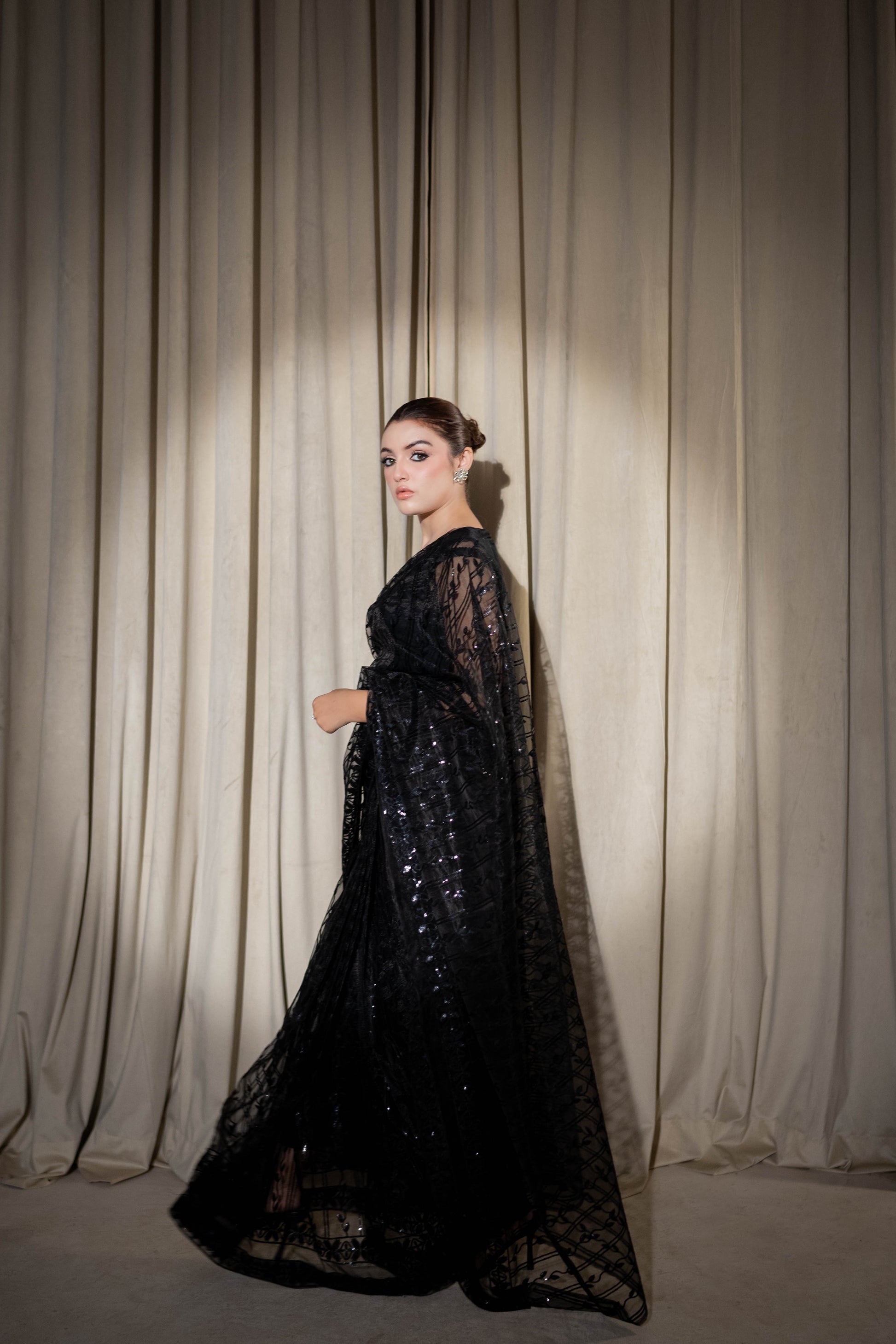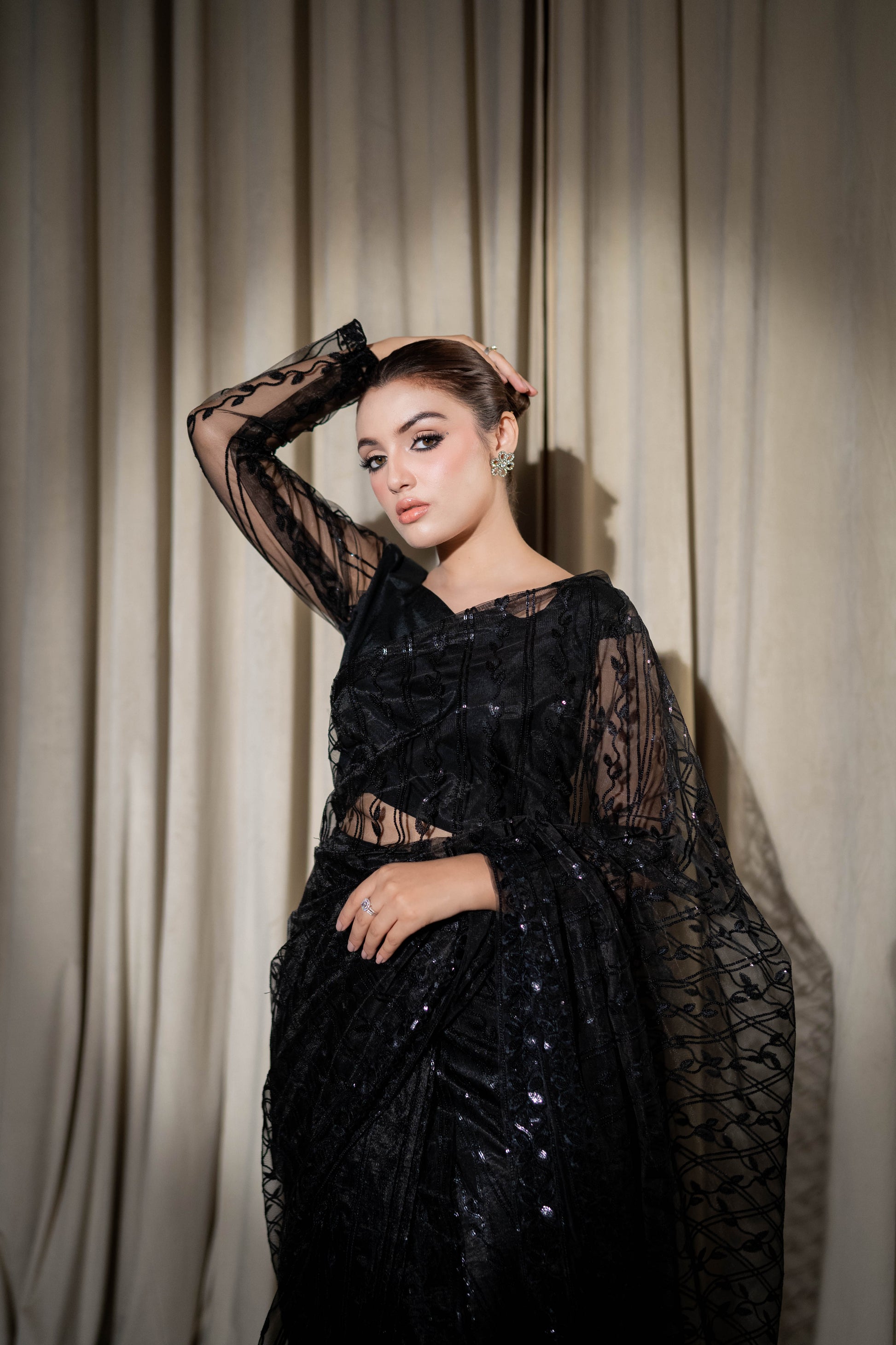 Introducing the "Showstopper Elegance" Elena Black Net Saree, an absolute head-turner. This saree, in striking black, is a stunning blend of elegance and show-stopping glamor, adorned with exquisite embroidery and sequins. Make a statement at any event with this extraordinary ensemble.