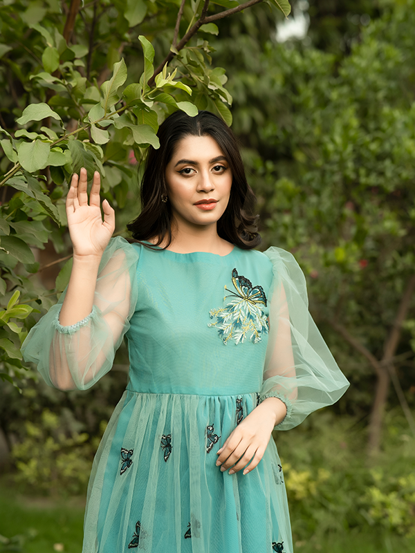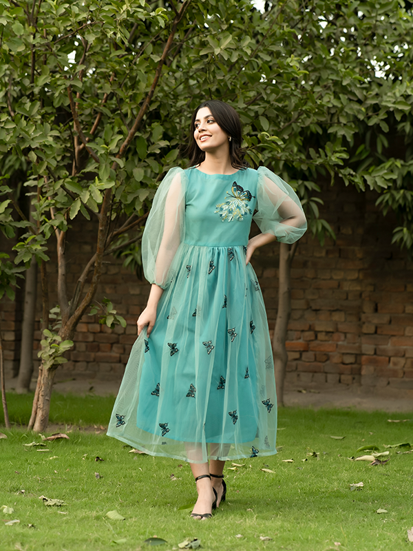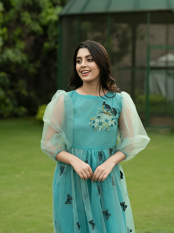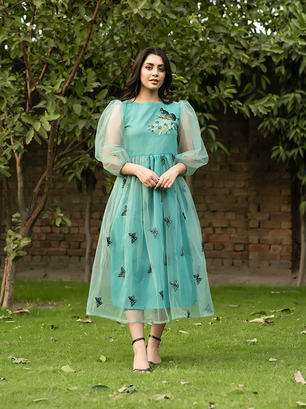Sky comes up as a beautiful net frock with embroidery and sequins work on butterflies in a eye catching sky-blue color to give you wings.