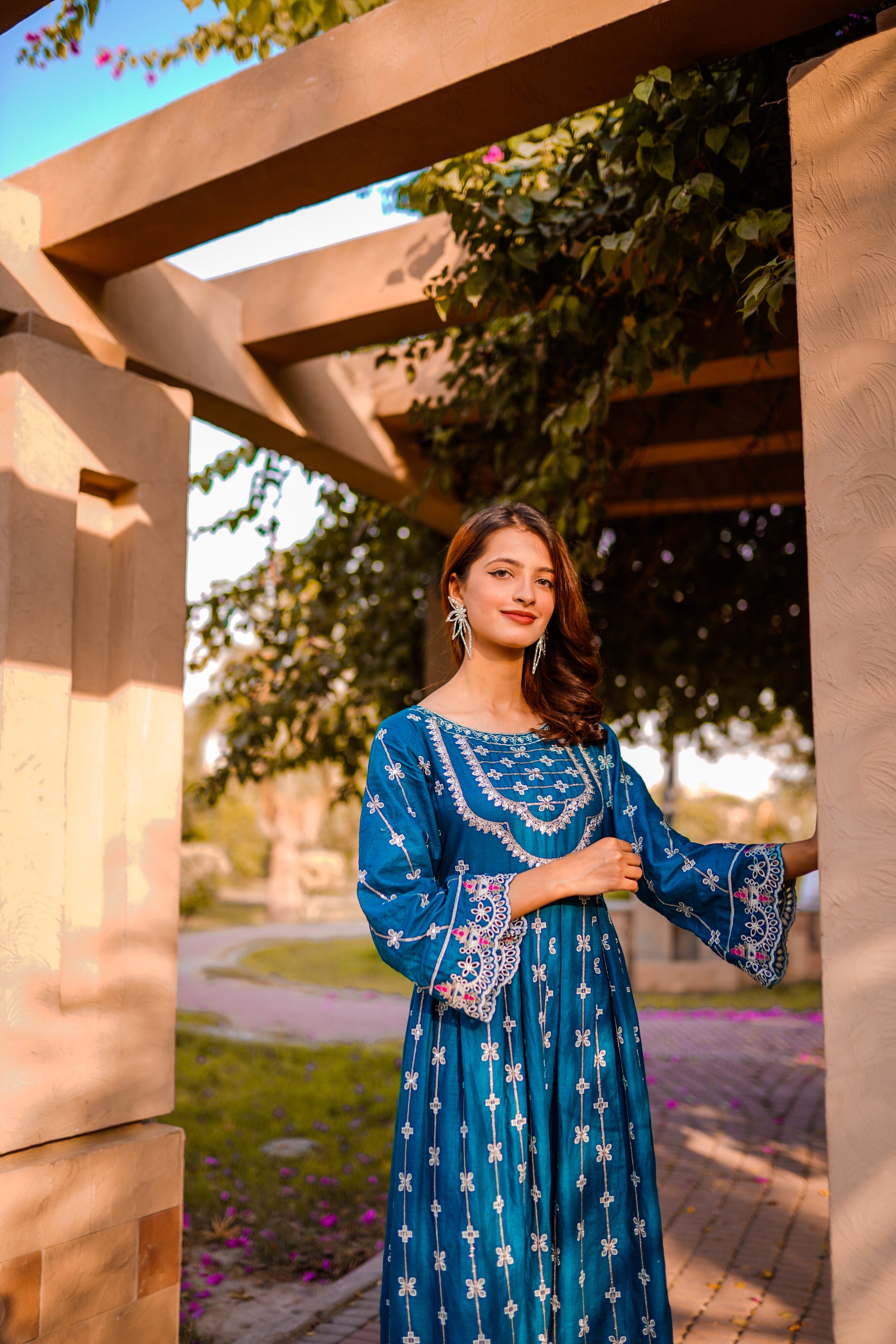 “Takhleeq” comes up as stitched heavy embroidered ravishing frock with the embellishment of Bowering, Twin sequins and Kari work.