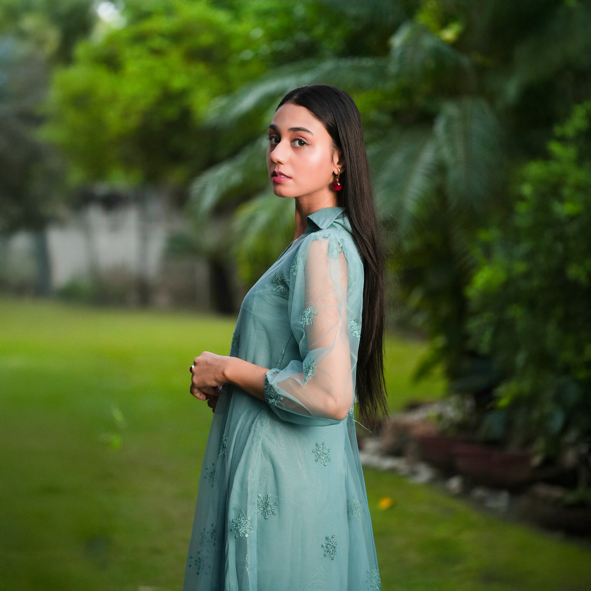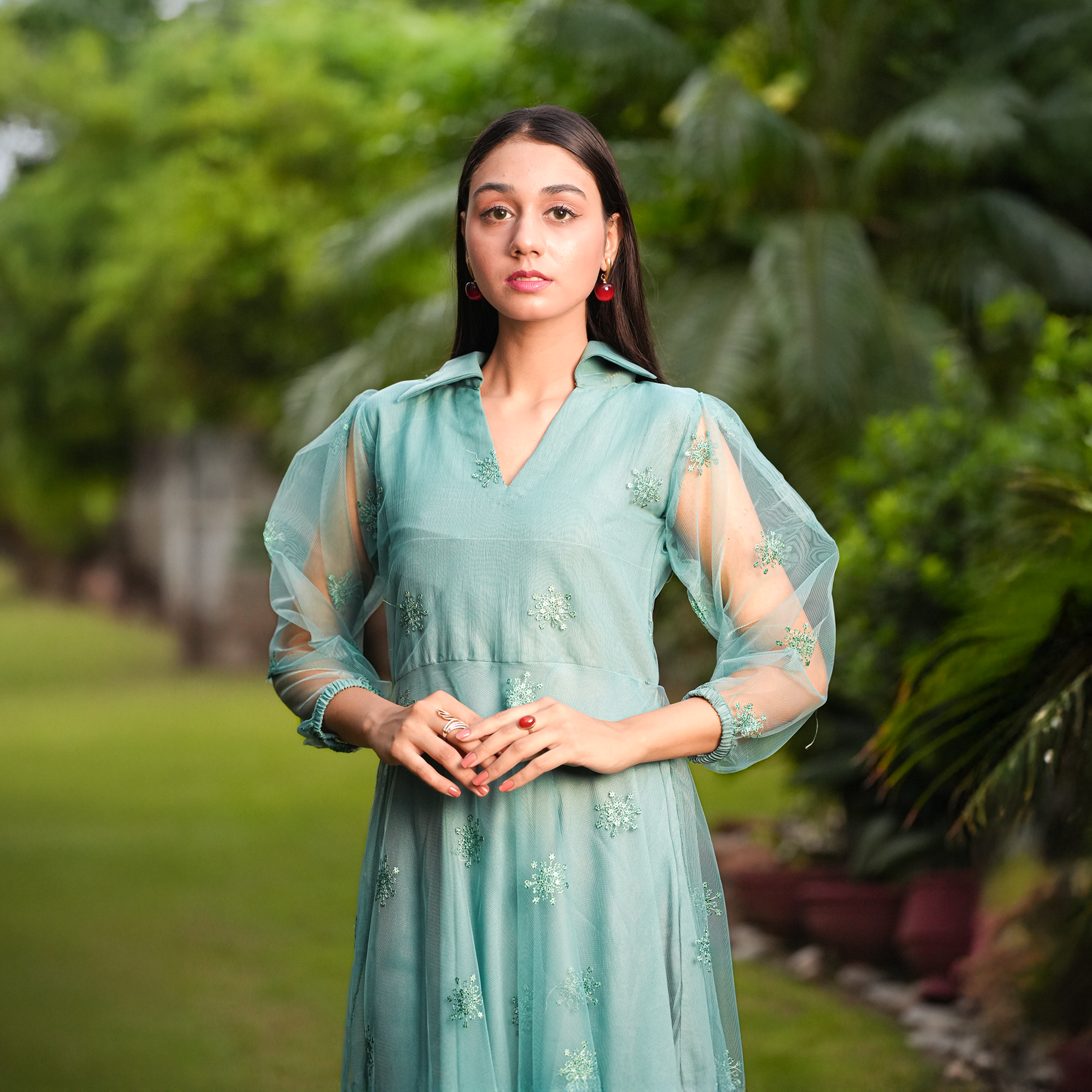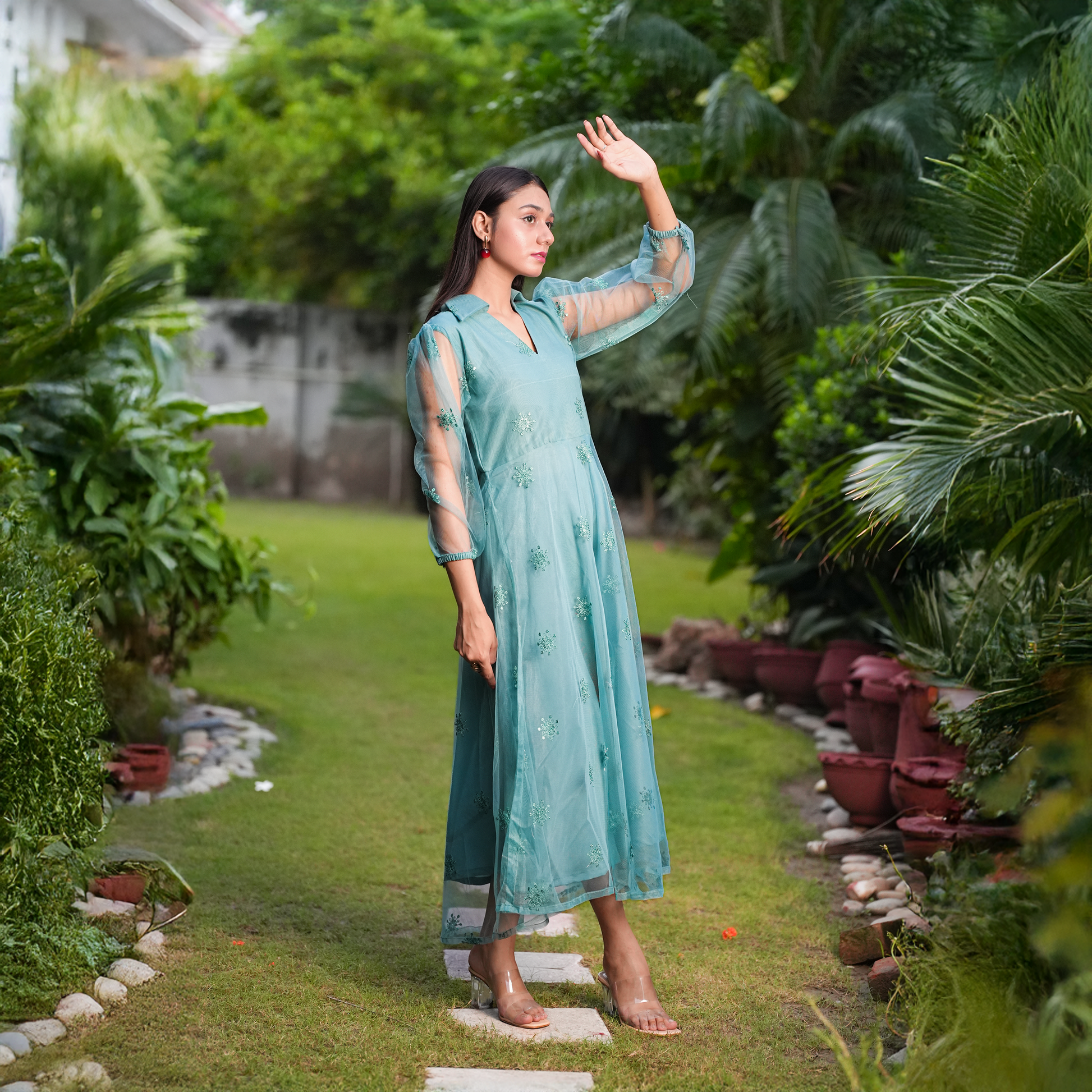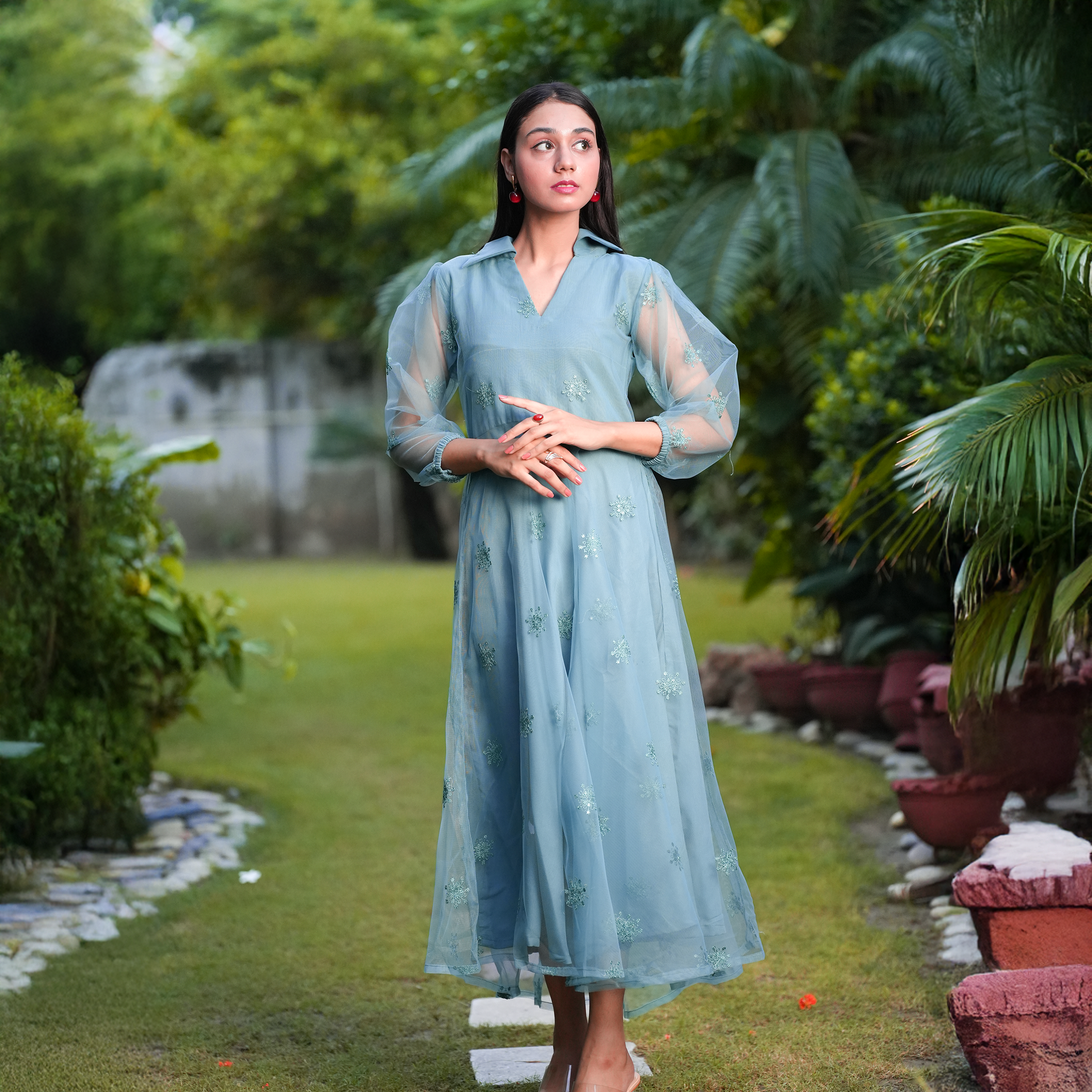 A breezy aqua dress adorned with delicate sequin florals and sheer puff sleeves. Light, elegant, and effortlessly chic—perfect for festive evenings or graceful day wear